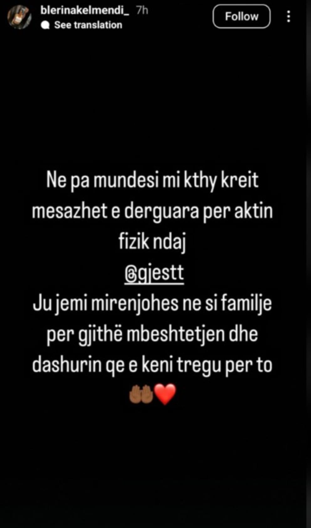 “Në pamundësi për t’i kthyer të gjitha mesazhet, për aktin fizik ndaj Gjestit, ju jemi mirënjohës ne si familje për gjithë mbështetjen dhe dashurinë që e keni treguar për të” – shkruan ajo në InstaStory.
