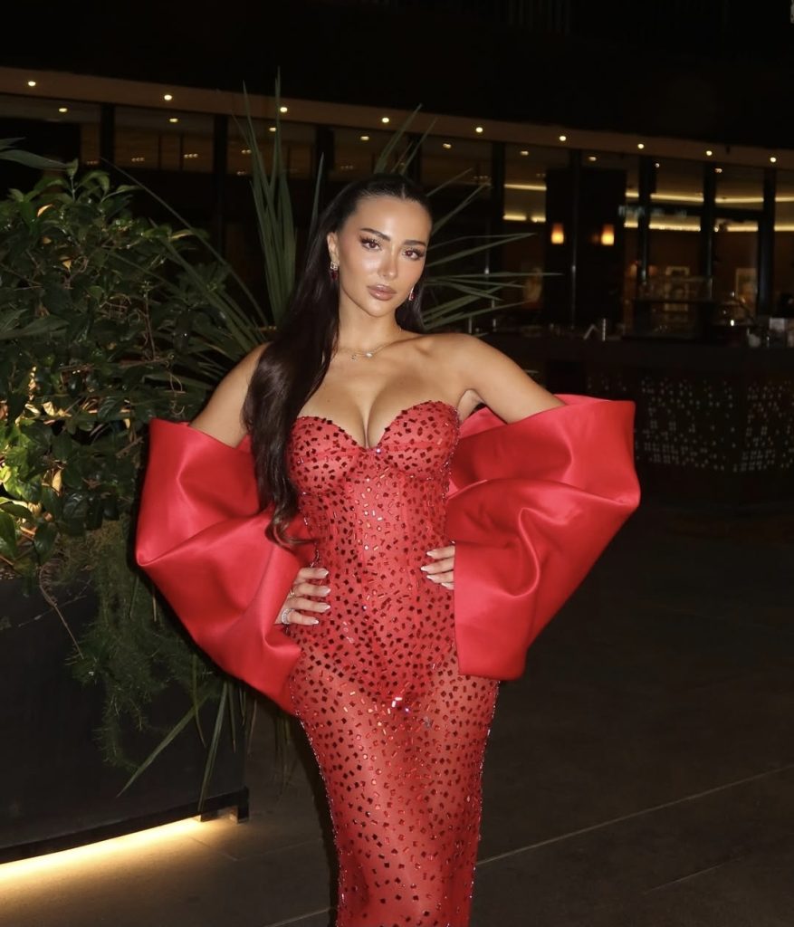 Influencuesja u shfaq e veshur me një fustan të kuq transparent të zbukuruar me detaje shkëlqyese dhe me mëngë voluminoze, duke nxjerrë në pah linjat e saj perfekte.