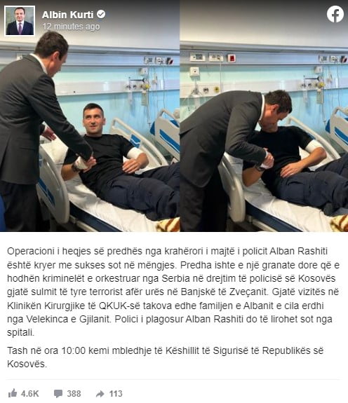 Kryeministri i Kosovës Albin Kurti, e ka vizituar policin Alban Rashiti, i cili u plagos sot në orët e hershme të mëngjesit.