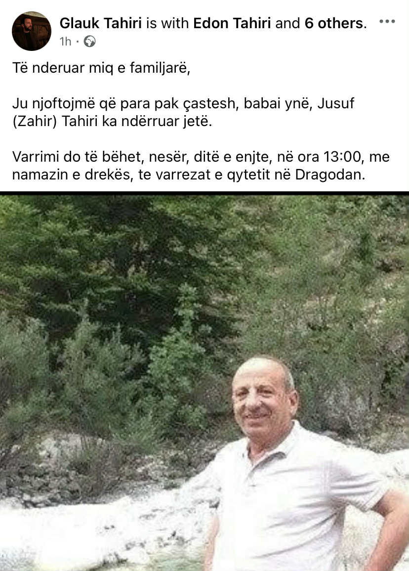 Me dhimbje të madhe njoftohet se ka ndërruar jetë Jusuf (Zahir) Tahiri, baba i Glauk dhe Edon Tahirit. Lajmin e kanë bërë të ditur familjarët përmes një njoftimi në rrjetet sociale, ku kanë shprehur pikëllimin e tyre të thellë për humbjen e babait dhe njeriut të dashur.