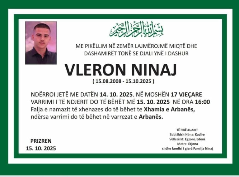 Sot në orën 16:00 do të varroset në varrezat e Arbanës i riu 17-vjeçar nga Prizreni, i cili humbi jetën dje në një aksident me motor.