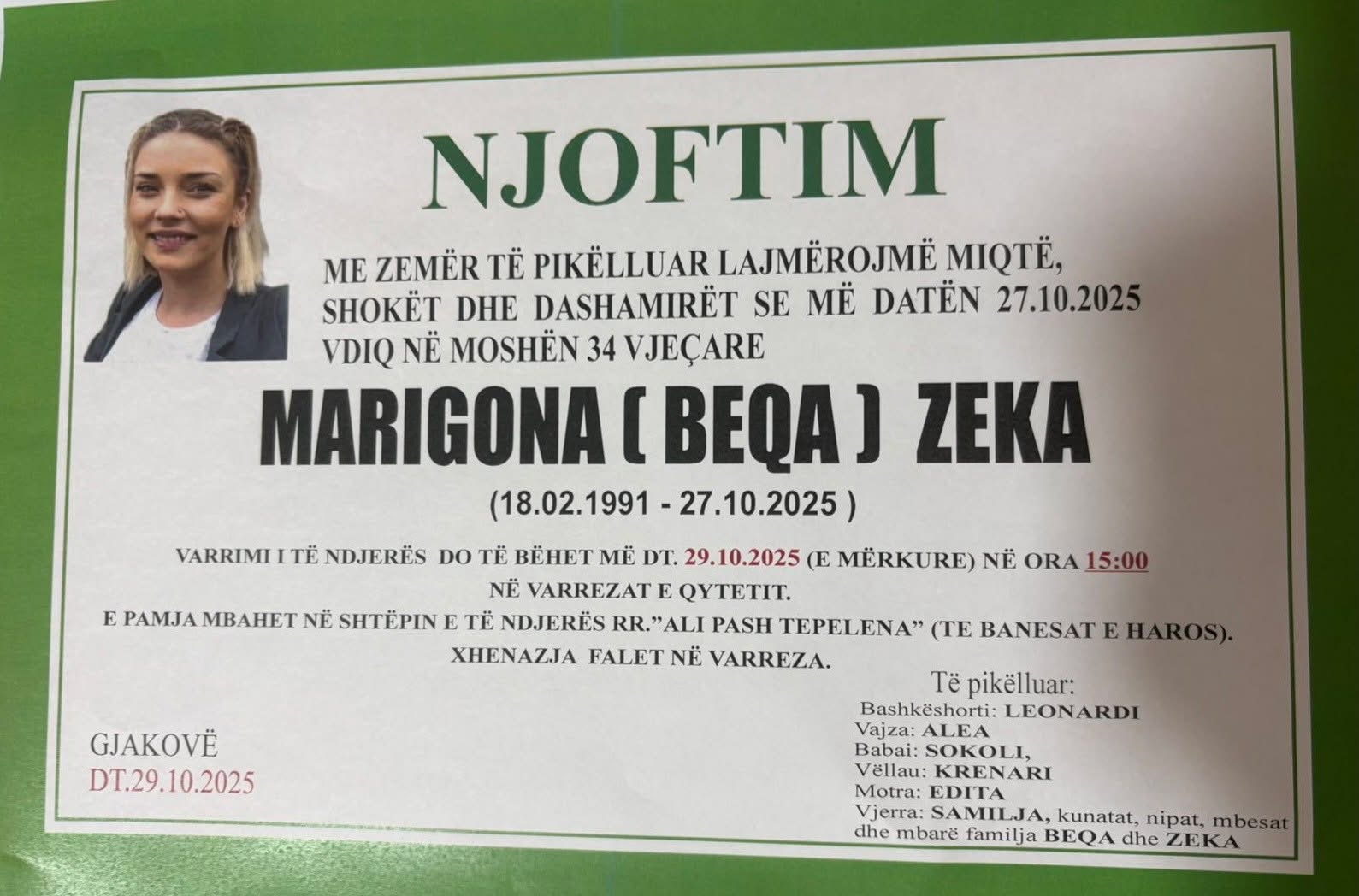 Sipas raportit 24-orësh të policisë, viktima fillimisht ishte dërguar në emergjencë, si pasojë e lëndimeve trupore ku më pas mjeku kujdestar e kishte konstatuar vdekjen e saj.