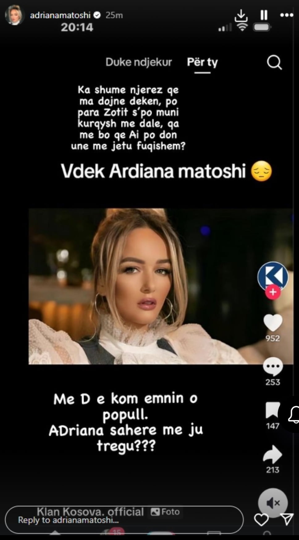 “Me D e kam emrin o popull. ADriana sa herë me ju tregu?”, shtoi Matoshi me një dozë humori, duke iu referuar mënyrës se si ishte shkruar gabim emri i saj në postim, i shkruar “Ardiana”.