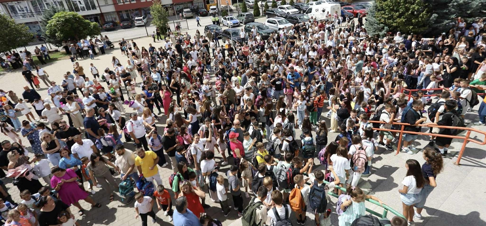 Në Shkollën Fillore “Bajram Curri”, ku u mbajtë një ceremoni e nisjes së vitit shkollorë në orën 13:00 nën rrezet përvëluese të diellit.