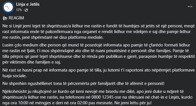 “Ne si Linjë jemi tejet të shqetësuar/a lidhur me rastin e fundit të humbjes së jetës së një personi, meqë rast informata ende të pakonfirmuara nga organet e rendit lidhur me vdekjen e saj dhe pamje lidhur me rastin, janë shpërndarë në disa platforma mediale”.