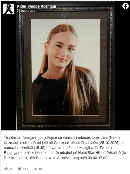 “Të nderuar familjarë, ju njoftojmë se varrrimi i mbesës tonë, Jeta (Naim) Kozmaqi, e cila ndërroi jetë në Gjermani, bëhet të shtunën (25.10.2025)me namazin i Ikindisë (15.30) në varrezat e fshatit Mazgit (afër Tyrbes). E pamja (e dielë, e hënë, e martë) mbahet në Hotel Star Hill në Prishtinë (te Rrethi i madh), afër Banesave të Arabëve, prej orës 09.00-17.00”, bëhet e ditur në njoftim.