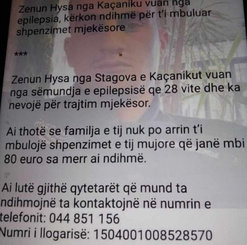 Zenun Hysa nga Stagova e Kaçanikut vuan nga sëmundja e epilepsisë dhe ka nevojë për trajtim mjekësor.
