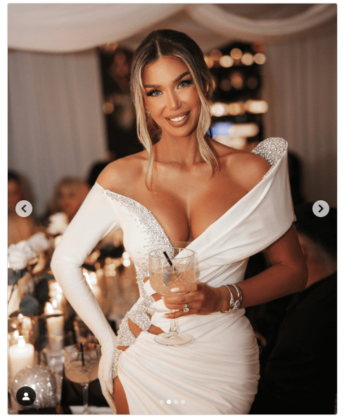 Me një fustan të bardhë, të ngushtë pas trupit, me detaje të shkëlqyeshme argjendi në pjesën e supeve dhe belit, ajo ka dhuruar një imazh që të lë pa fjalë.