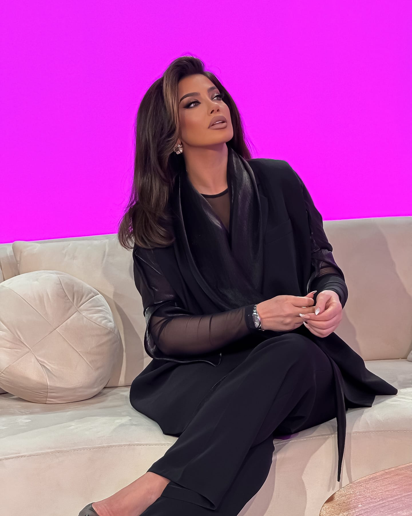 E veshur totalisht në të zeza, me një kostum elegant e transparent në pjesën e krahëve dhe me një sfond rozë të ndezur që kontraston fuqishëm me dukjen e saj prej dive klasike, Arjola duket si një figurë që sapo ka dalë nga një film hollivudian noir.
