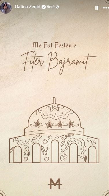 Show BizzBajrami i parë si e martuar, ja si e kaloi Dafina këtë festë si nuse e shtëpisë – “Dallama e dimija”by telalli.infoApril 1, 2025April 1, 2025Këngëtarja e njohur shqiptare, Dafina Zeqiri ka uruar festën e Fitër Bajramit.Në një foto ilustrim të punuar në emër të saj, këtë festë artistja ua uroi të gjithë besimtarëve myslimanë.“Me fat festa e Fitër Bajramit”, ka shkruar ndër të tjera Dafina.