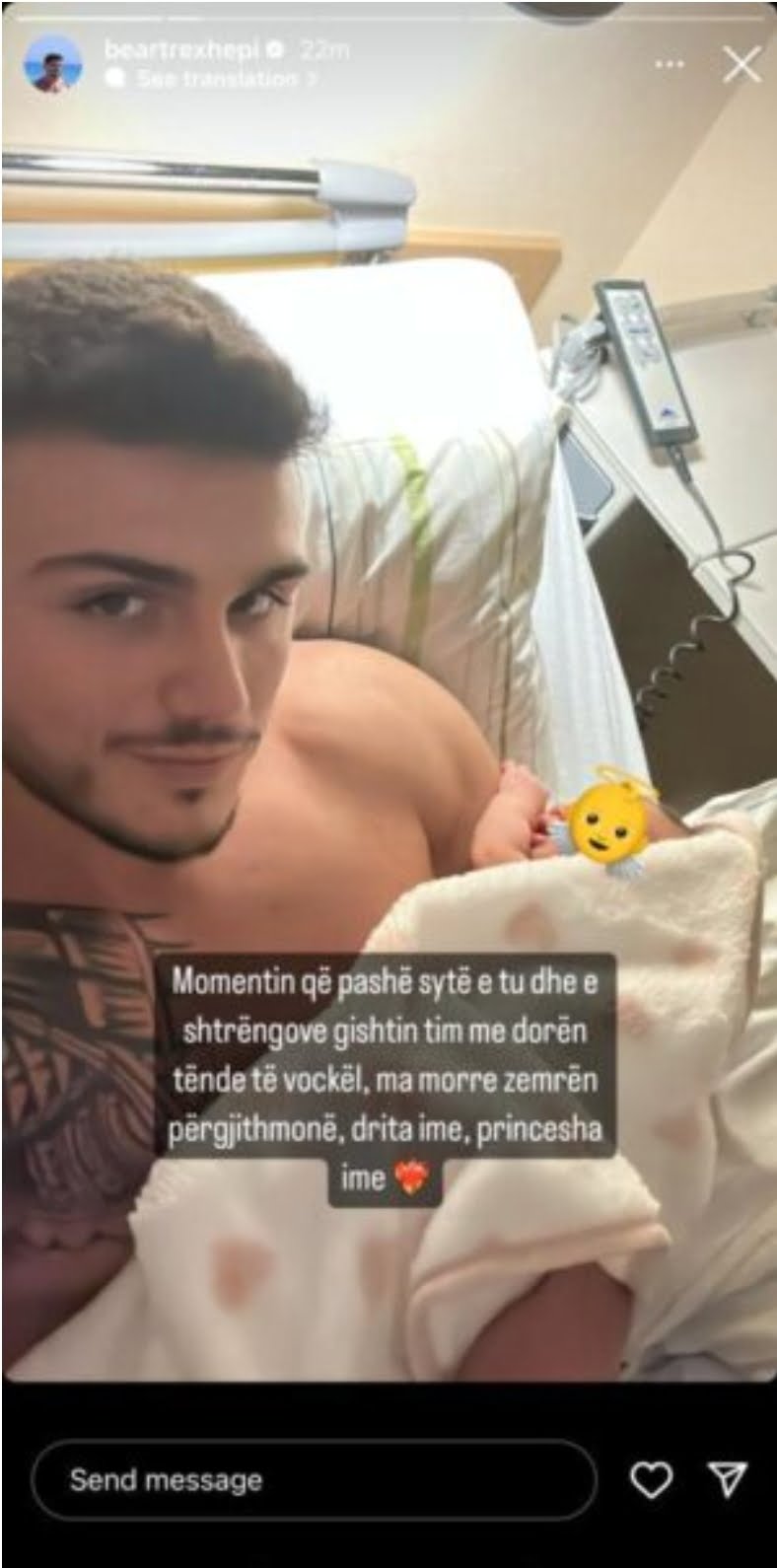 Bearti ndau vet postimin në Instastory, duke shkruar “Momentin që pashë sytë e tu dhe shtrëngove gishtin tim me dorën tënde të vockël, ma more zemrën përgjithmonë, dashuria ime princesha ime”.