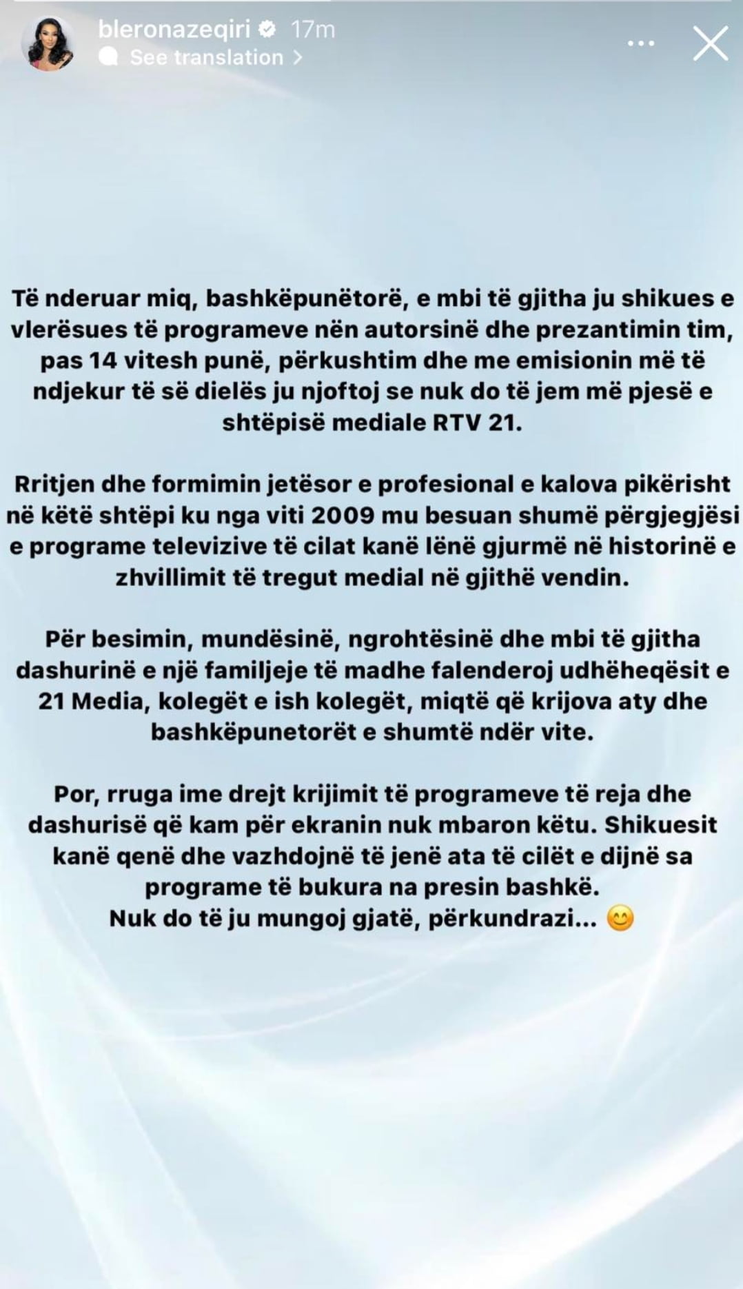Blerona këtë e bëri të ditur me një postim në Instastory.