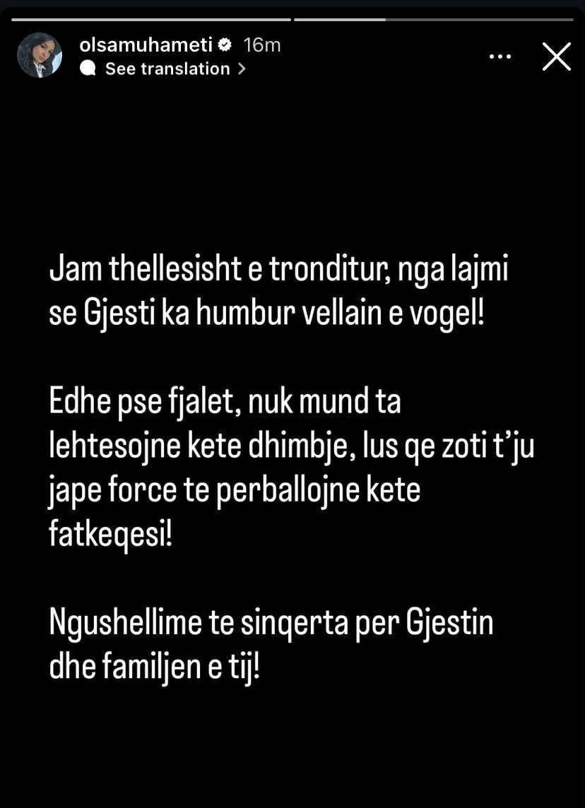Në orët e fundit, lajmi për ndarjen tragjike me jetën të vëllait të këngëtarit Gjesti i ka tronditur rrjetet sociale dhe mediat. Ndër reagimet që kanë marrë vëmendje është edhe ai i Olsa Muhamet, e cila përmes një postimi ka shprehur dhimbjen e saj dhe solidaritetin për artistin dhe familjen.