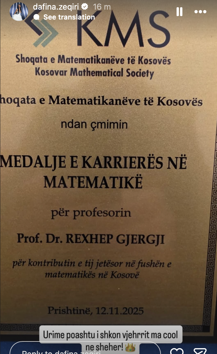 Nderimi i madh i është bërë vjehrrit të këngëtares nga Shoqata e Matematikanëve të Kosovës (KMS), që i dha atij çmimin “Medalja e Karrierës në Matematikë” për kontributin e tij jetësor në këtë fushë.