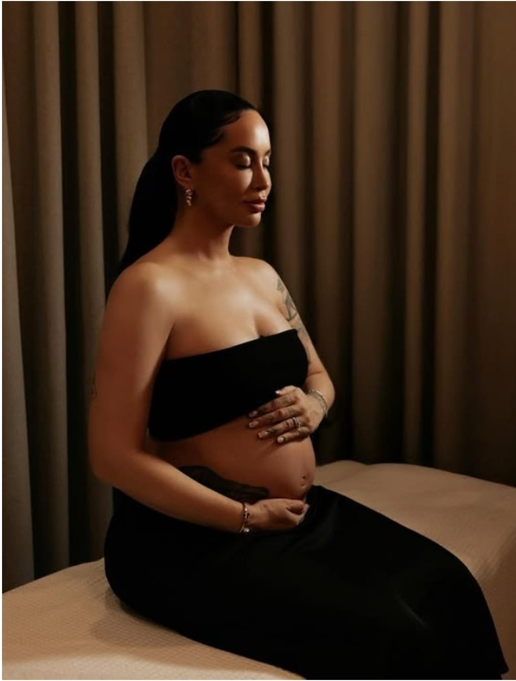 Këngëtarja e njohur mbante dorën mbi bark ndërsa buzëqeshte ëmbëlsisht, duke reflektuar qetësi dhe lumturi.