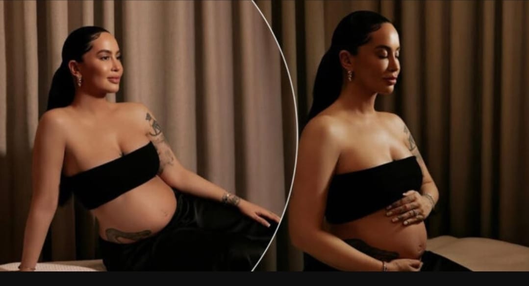 Këngëtarja e njohur mbante dorën mbi bark ndërsa buzëqeshte ëmbëlsisht, duke reflektuar qetësi dhe lumturi.