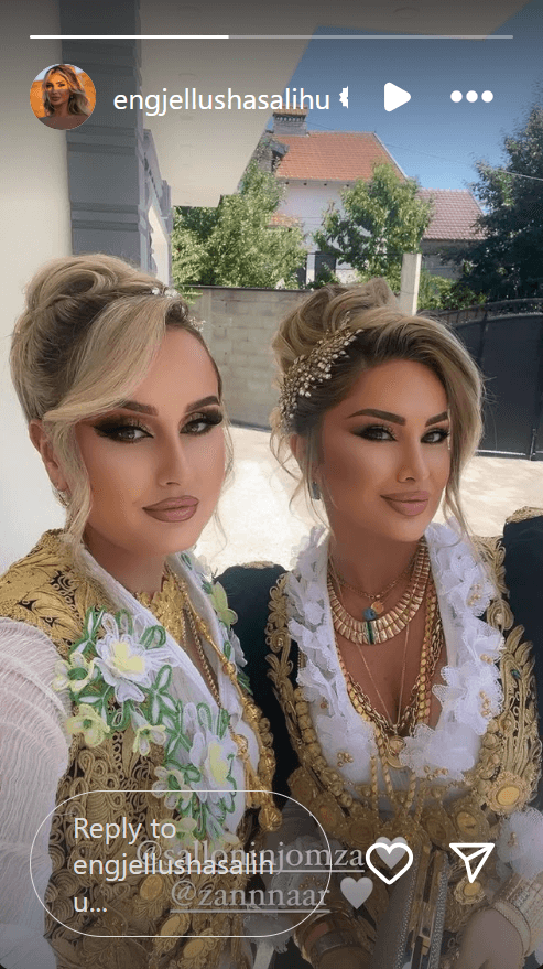 Këngëtarja e njohur Engjellushe Salihu ka marrë vëmendjen e ndjekësve të saj në rrjete sociale me një paraqitje të veçantë. Ajo është shfaqur për herë të parë e veshur si nuse me dimija tradicionale shqiptare, gjatë një dasme në familje. Në një foto të postuar në Instagram, Engji shihet krah për krah me kunatën e saj, të dyja të veshura me kostume elegante dhe të zbukuruara me motive kombëtare dhe detaje ari.