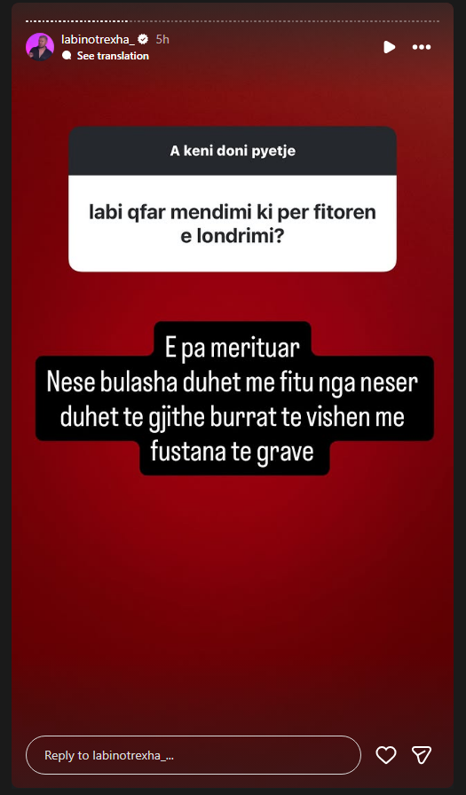 Gjithashtu u pyet se çfarë mendimi ka për fitoren e Londrimit ku shkroi; “E pamerituar. Nese bulasha duhet me fitu nga neser duhet te gjithe burrat të vishen me fustana të grave”.