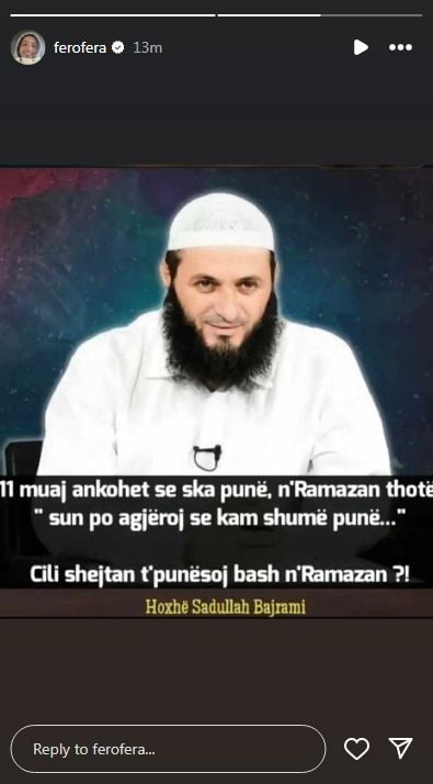 Fero ka një kohë që ka treguar se i është përkushtuar fesë, ndërkaq përmes postimit të fundit ai ka bërë një reagim për personat që nuk e agjërojnë Ramazanin me arsyetimin se kanë punë.