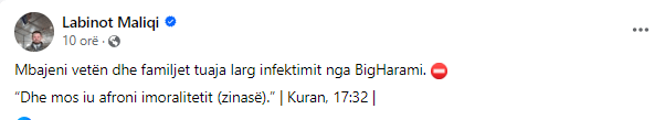 “Mbajeni vetën dhe familjet tuaja larg infektimit nga BigHarami”, ka shkruar Maliqi.