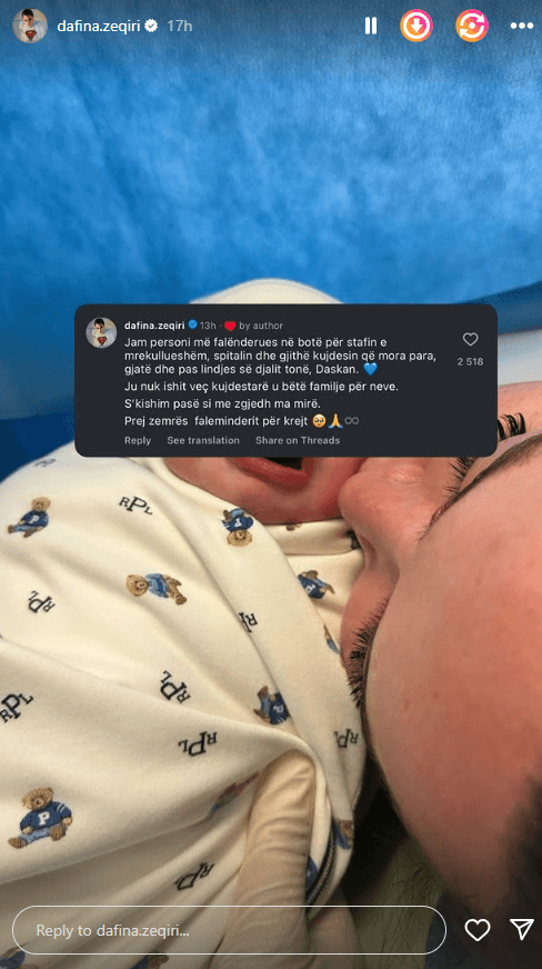Pak ditë më parë, Dafina ndau me ndjekësit emocionet e mëdha nga ardhja në jetë e djalit të saj, Daskan, duke falënderuar personelin mjekësor dhe ndarë momente të ëmbla me ndjekësit e saj.