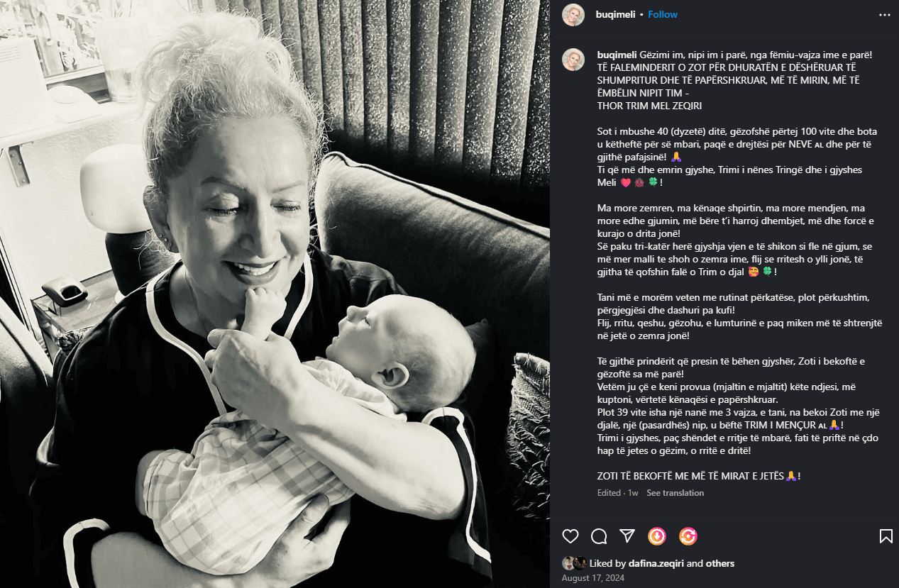Madje, ajo ka zgjedhur të risjellë një kujtim të vjetër nga gushti i vitit 2024, duke riedituar dhe ripostuar një foto me nipin tjetër, fëmijën e vajzës tjetër të saj, tëshoqëruar me një mesazh të gjatë e të ndjerë për të, ku përmendet emri i djalit dhe falënderime për jetën e re në familje, por pa asnjë aludim për Dafinën apo foshnjën e saj.