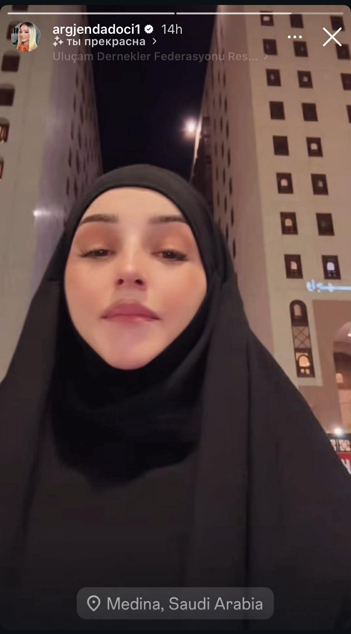 Show BizzKëngëtarja e njohur vendos mbulesën, duket për mrekulliby telalli.infoNovember 11, 2025November 11, 2025Argjenda Doci ka ndarë me ndjekësit e saj në rrjete sociale disa momente nga vizita e saj në vendet e shenjëta në Arabinë Saudite.Ajo atje shihet e mbuluar me mbulesë islame.Kujtojmë që Argjenda njihet edhe më parë për besimin e saj në fenë Islame.