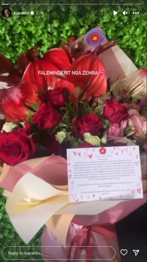 Show BizzKiara paska qenë veç fat, sapo pranoi dhuratën më të bukur dhe më romantike që keni parë ndonjëherëby telalli.infoOctober 6, 2023October 6, 2023Kiara Tito është një ndër moderatoret më të dashura për publikun.Ajo u bë akoma më e dashur pas martesës së saj me Luizin.Kiara është shumë aktive në rrjetet sociale, me postime nga më të ndryshmet.E përmes fotografisë së fundit ajo ka treguar se ka pranuar si dhuratë një buqetë me lule.