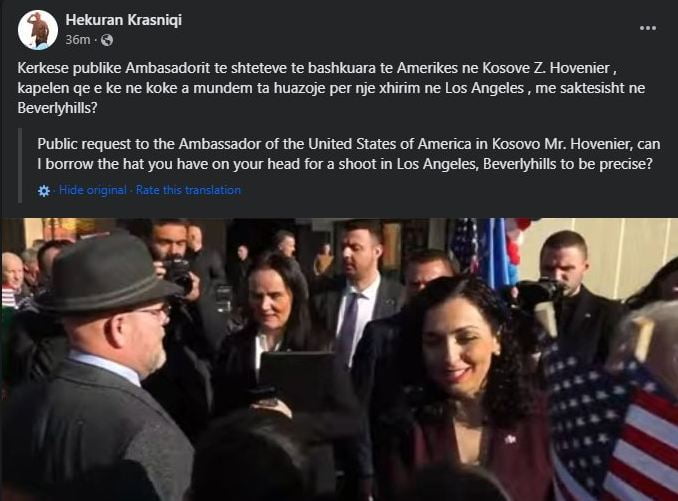 “Kërkesë publike Ambasadorit të Shteteve të Bashkuara të Amerikës në Kosovës, z.Hovenier, kapelen që e ke në kokë a mundem ta huazojë për një xhirim në Los Angeles, më saktësisht në Beverlyhills?”, ka shkruar tutje Krasniqi.