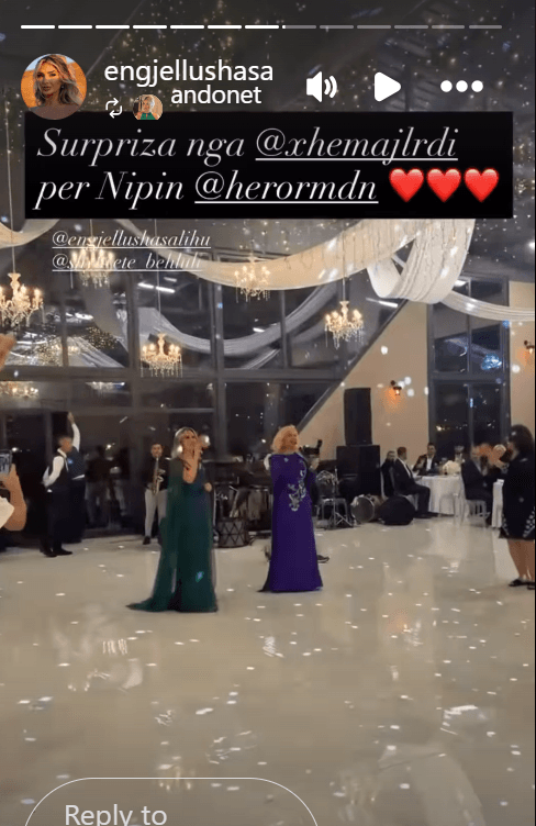 Në një atmosferë magjike dasme, këngëtaret e dashura të muzikës popullore, Engjellusha Salihu dhe Shyhrete Behluli, dhuruan një surprizë të paharrueshme për dasmorët. Dyshja u shfaq në sallë duke performuar live për të pranishmit, duke sjellë gëzim dhe emocion me zërat e tyre karakteristikë.