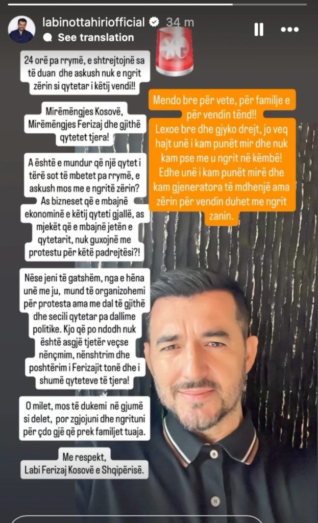 Këngëtari i njohur Labinot Tahiri ka reaguar me ashpërsi pas ndërprerjes së rrymës elektrike që, sipas tij, la për 24 orë qytetin e Ferizajt dhe shumë qytete të tjera pa energji elektrike