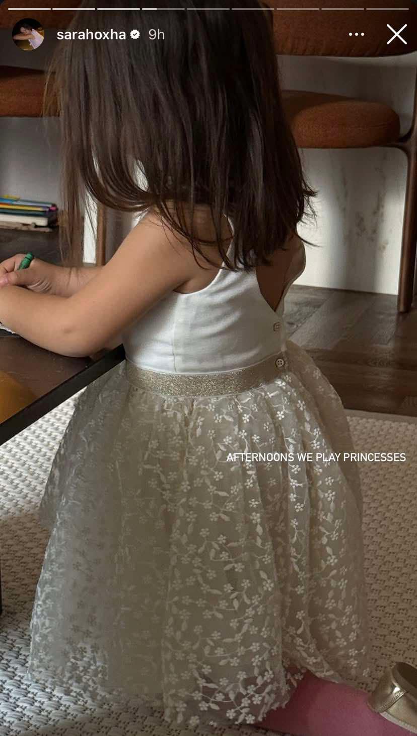 E veshur me një fustan të bardhë elegant dhe me flokë të rregulluara si një princeshë e vogël, Sara e ka admiruar të bijën.