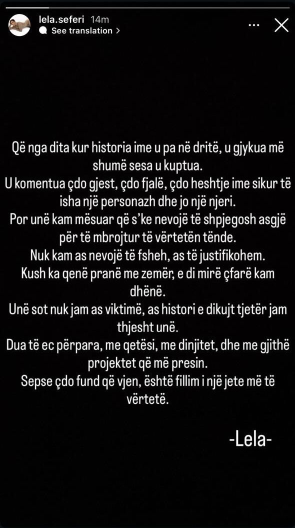“Që nga dita kur historia ime u pa në dritë, u gjykua më shumë sesa u kuptua. U komentua çdo gjest, çdo fjalë, çdo heshtje ime sikur të isha një personazh dhe jo një njeri. Por unë kam mësuar që s’ke nevojë të shpjegosh asgjë për të mbrojtur të vërtetën tënde,” – shkruan ajo.