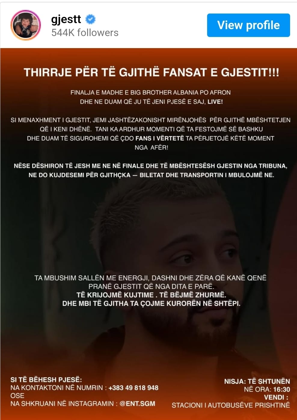 Menaxhmenti fton fansat të bëhen bashkë për të mbështetur Gjestin në finale – nisja për në Tiranë realizohet nga Prishtina