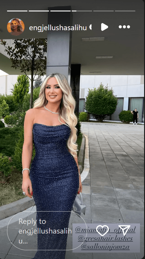 E veshur me një fustan të gjatë, ngjyrë blu me shkëlqim të lehtë, i cili i theksonte hijshëm linjat trupore, Engji ka rrezatuar një bukuri natyrale, por edhe një shkëlqim të brendshëm që dukej se vinte nga emocionet e forta dhe nga ndjesia e përmbushjes personale.