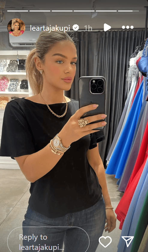 Në një paraqitje krejt të natyrshme dhe larg shkëlqimit të zakonshëm të skenës, Learta Jakupi është parë duke punuar në dyqanin e saj të modës, e veshur me një bluzë të zezë të thjeshtë dhe xhinse. Pa grime të rëndë dhe pa veshje tradicionale, Learta sërish shkëlqen me stilin e saj minimalist dhe elegancën e natyrshme.