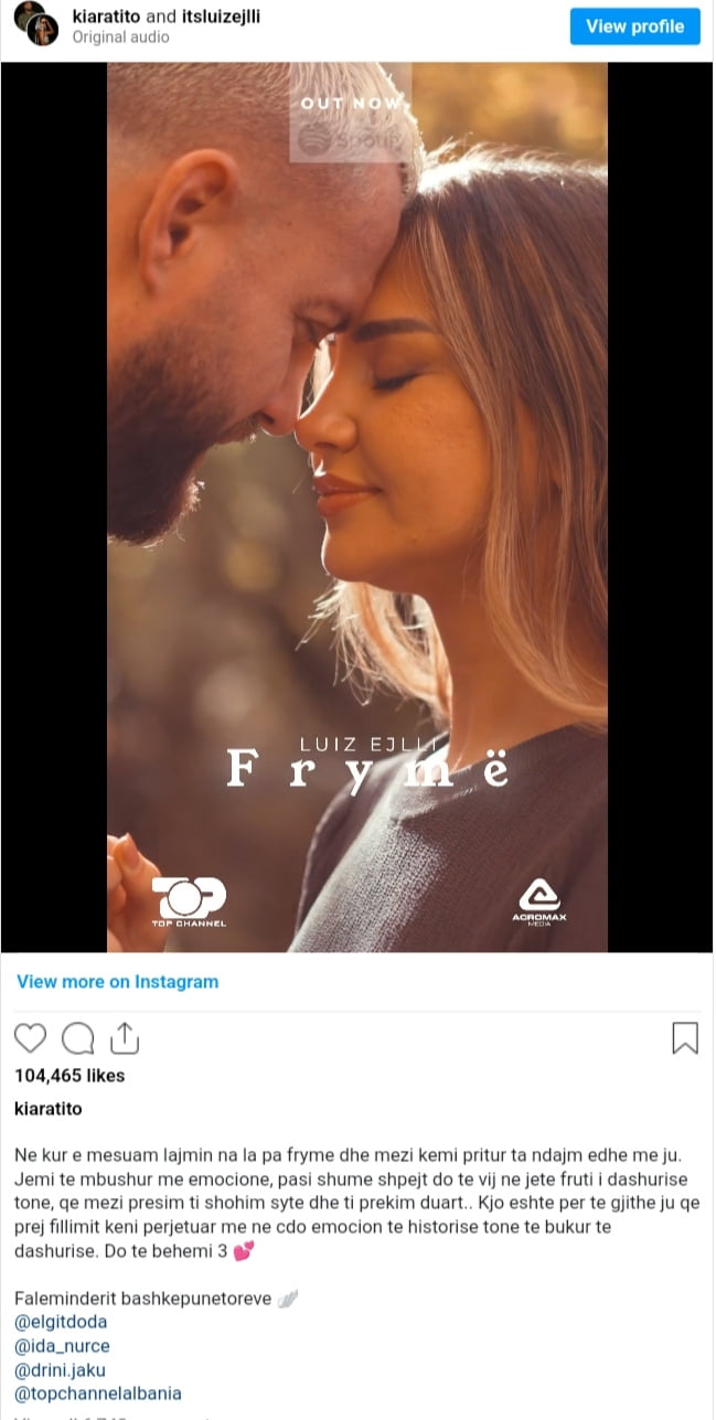 Pasi e konfirmuan me këngën ‘Frymë’ dedikim për vogëlushen e tyre që do të vijë në jetë, çifti kanë bërë dhe reagimin e parë duke ndarë emocionet e tyre me ndjekësit. Në një postim në ‘Instagram’, Kiara dhe Luizi shprehen se kanë ngelur ‘pa frymë’, kur morën vesh lajmin e ëmbël se do të bëheshin prindër.
