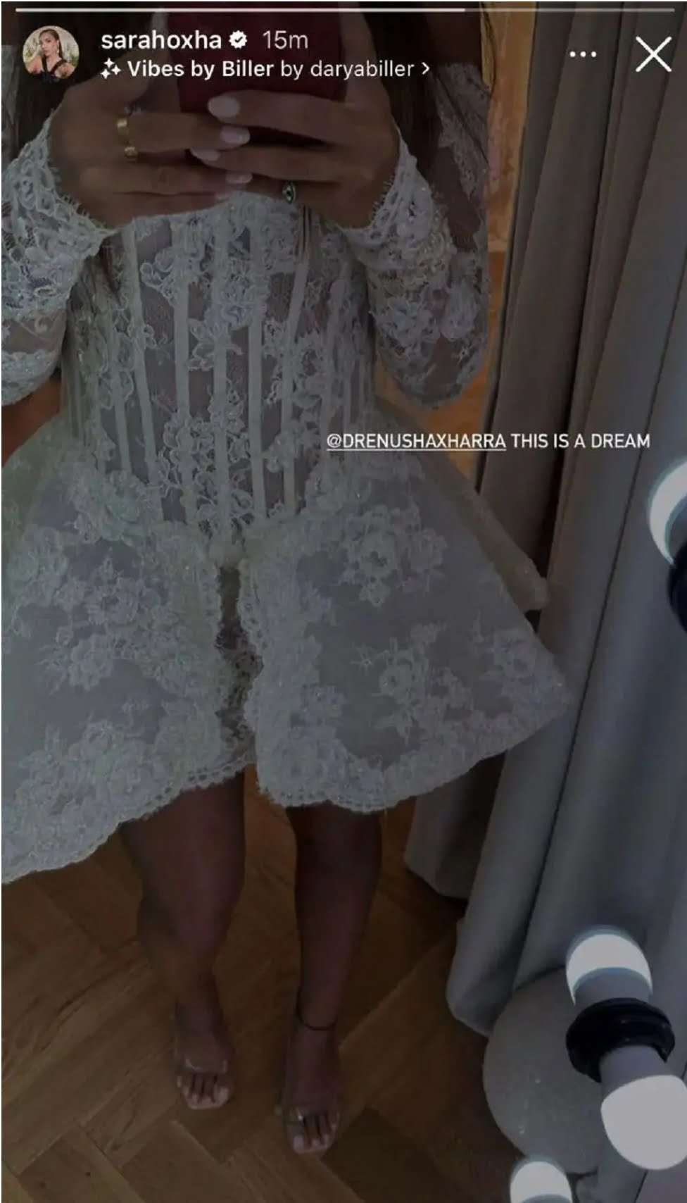 E veshur në një fustan të bardhë dhe i shkurtër ku shihet Sara, duke etiketuar kreatoren, ndjekësit krijuan disa pikëpyetje, se mos do ketë një dasëm nga Ledri dhe Sara.
