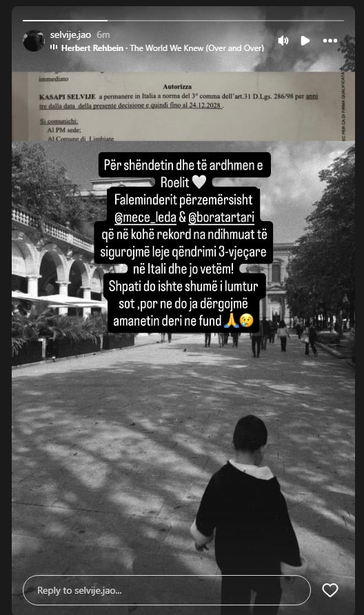 Selvija ka theksuar se kjo leje qëndrimi përfaqëson një hap shumë të rëndësishëm për shëndetin dhe të ardhmen e vogëlushit Roel, duke lënë të kuptohet se qëndrimi në Itali lidhet drejtpërdrejt me mundësi më të mira trajtimi, kujdesi dhe perspektive për jetën e tij.