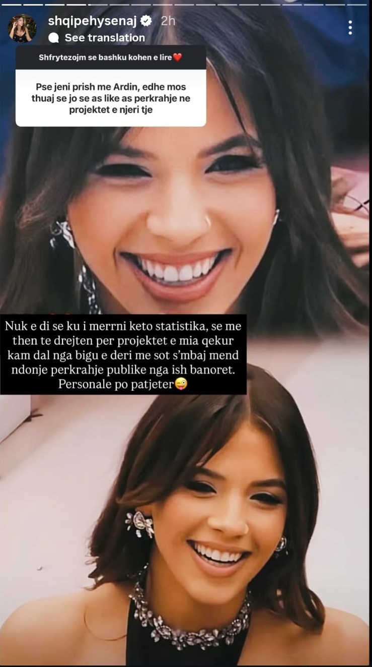 Në një pyetje që iu drejtua në Instagram, Shqipja u pyet hapur pse nuk shihet më me Ardin dhe pse nuk ka përkrahje mes tyre në projekte. Ajo u përgjigj: “Nuk e di se ku i merrni këto statistika, se me thënë të drejtën për projektet e mia qysh kam dalë nga Bigu e deri më sot s’mbaj mend ndonjë përkrahje publike nga ish-banorët. Personale po patjetër.”