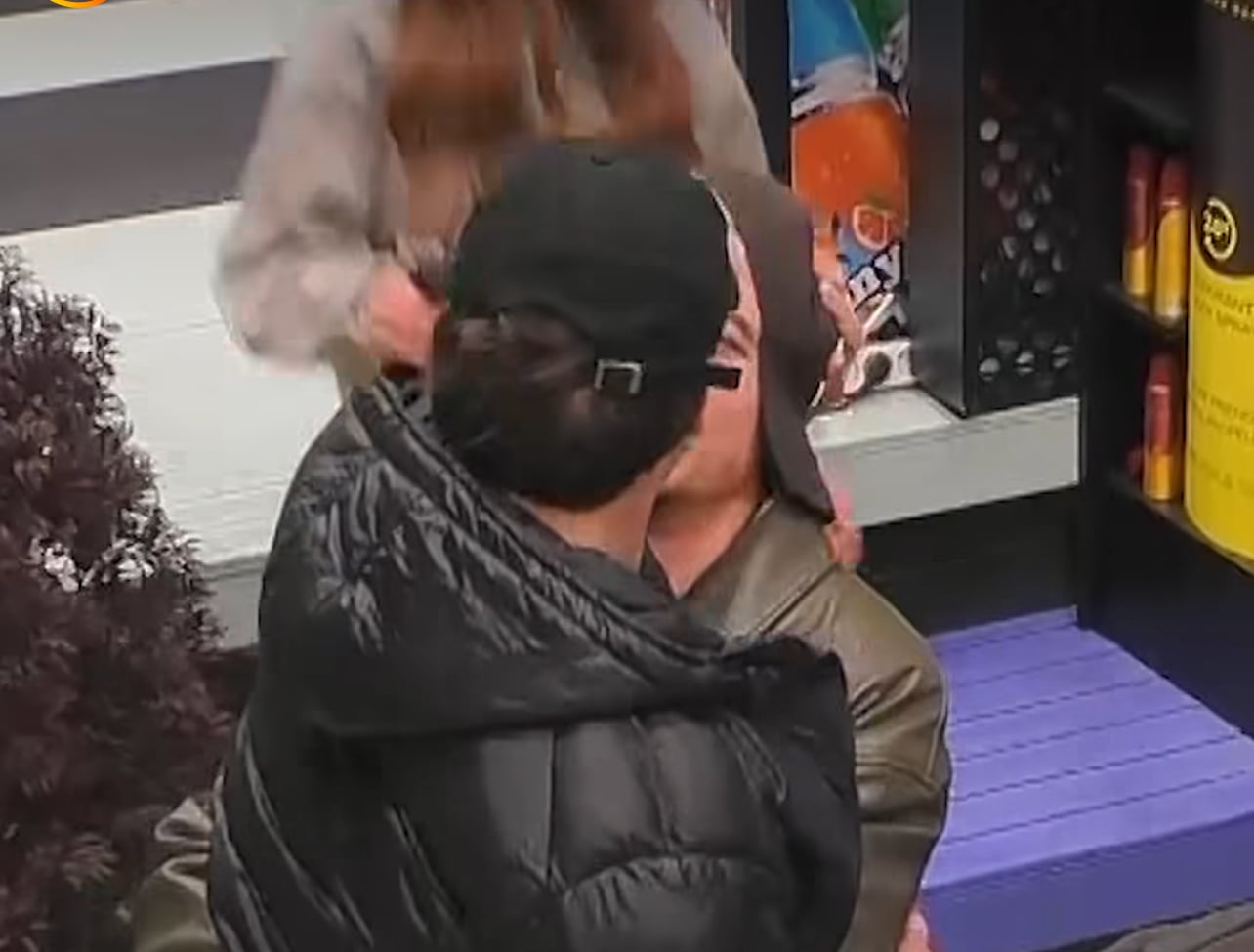 Teksa bisedonin me banorët e tjerë, dyshja filloi t’i afrohej njëri-tjetrit në mënyrë të qëllimshme dhe me shumë humor. Me një koordinim që dukej sikur ishte menduar paraprakisht, ata u shtirën sikur po shkëmbenin një puthje të vërtetë.