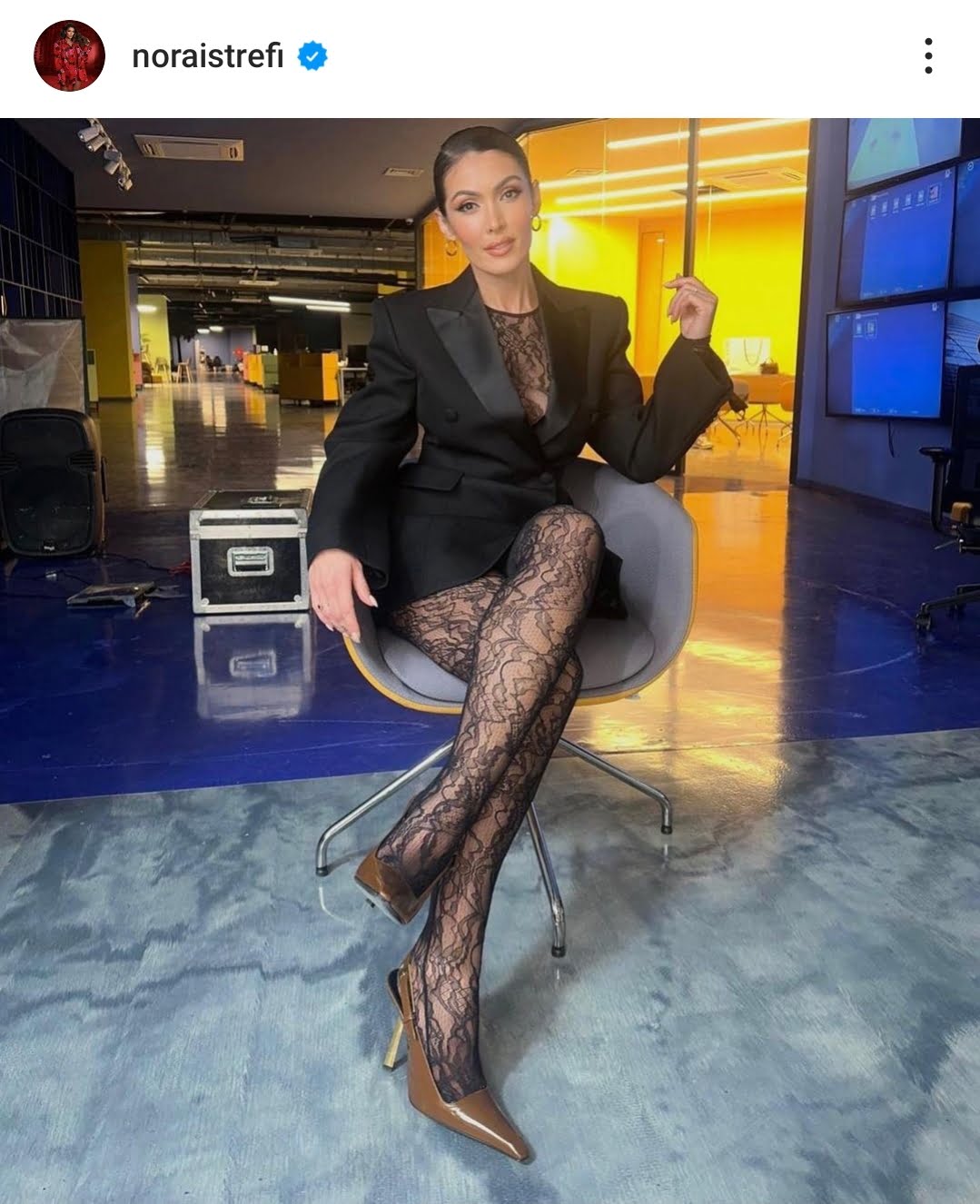 E veshur me një setër të zezë dhe me me një fustan krejtësisht i tejdukshëm në formë të rrjetës, Nora po shfaqet super joshëse.